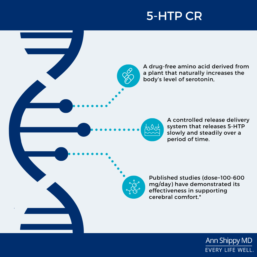 Published studies (dose~100-600 mg/day) have also demonstrated the effectiveness of 5-HTP supplementation in supporting cerebral comfort.*