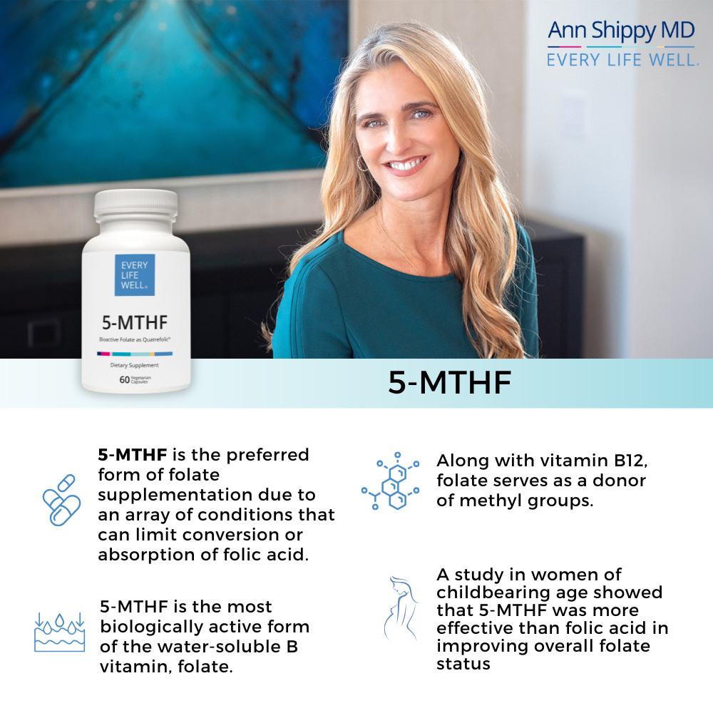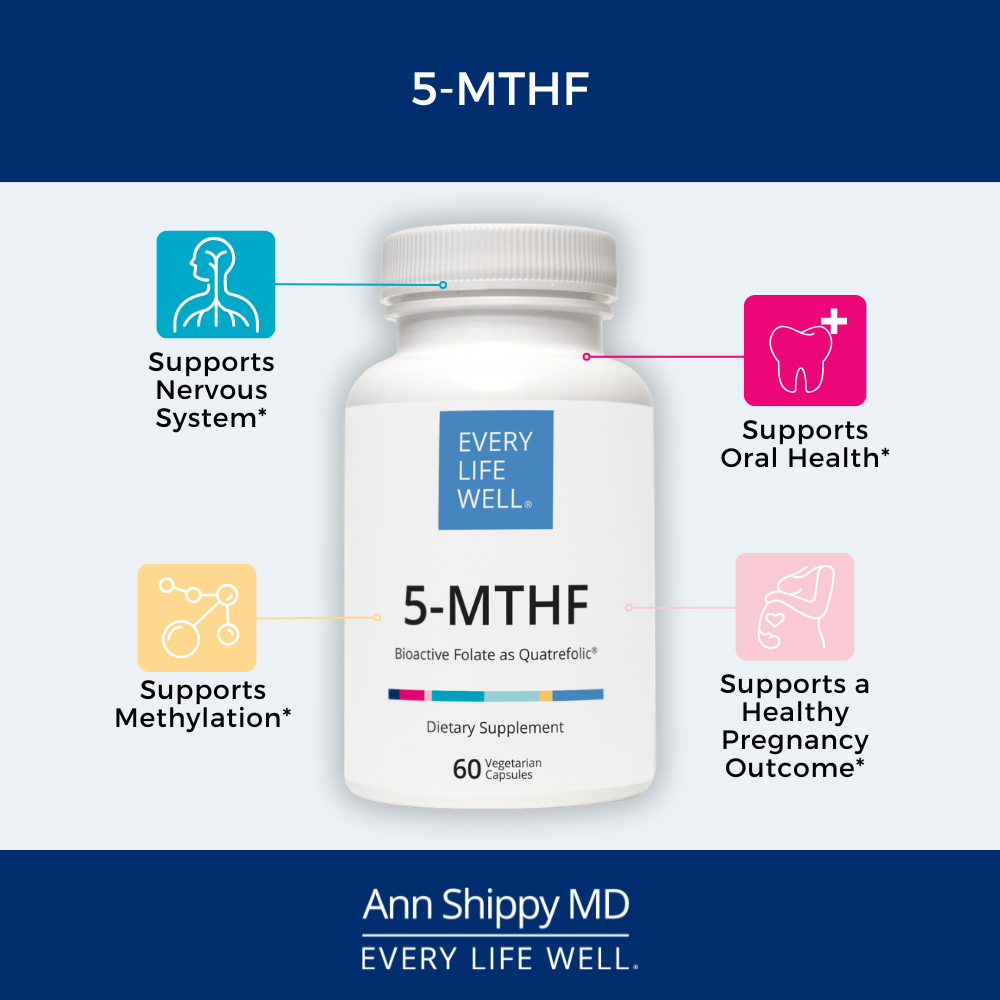 5-MTHF provides the biologically active form of folate, reduces the potential for masking hematological symptoms of vitamin B12 deficiency, reduces interactions with drugs that inhibit dihydrofolate reductase, overcomes folate metabolism challenges associated with functioning of methylenetetrahydrofolate reductase (MTHFR), and prevents the potential negative effects of UMFA in the peripheral circulation.*