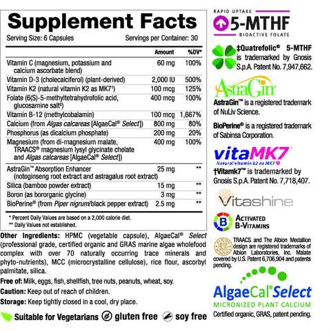 Other Ingredients: HPMC (vegetable capsule), AlgaeCal® Select (professional grade, certified organic and GRAS marine algae wholefood complex with over 70 naturally occurring trace minerals and phyto-nutrients), MCC (microcrystalline cellulose), rice flour, ascorbyl palmitate, silica.