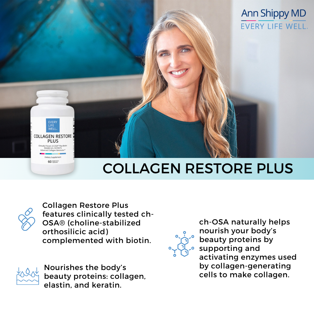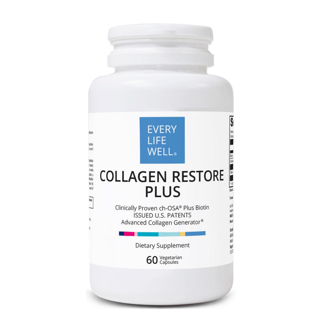 Collagen Restore Plus features clinically tested ch-OSA® (choline-stabilized orthosilicic acid) complemented with biotin.