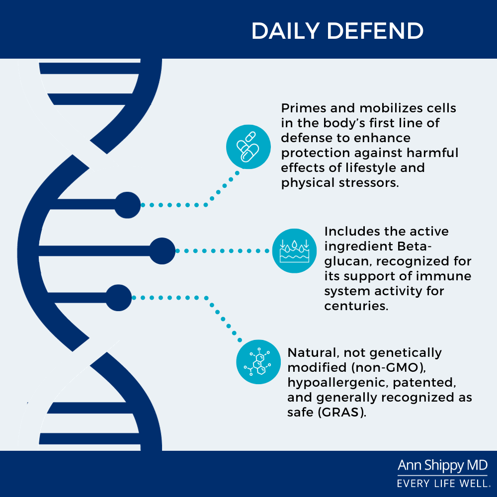 Taken orally, Daily Defend, without over-stimulating, primes and mobilizes cells in the body’s first line of defense to enhance protection against harmful effects of lifestyle and physical stressors.*
