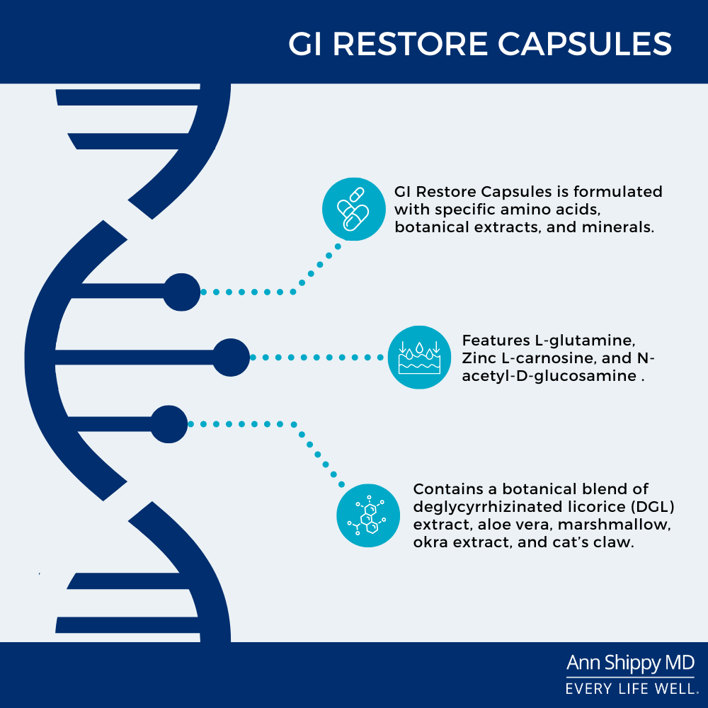 GI Restore also contains a botanical blend of deglycyrrhizinated licorice (DGL) extract, aloe vera, marshmallow, okra extract, and cat’s claw that provides support for healthy intestinal function by coating and soothing the intestinal lining, and these ingredients promote the body’s natural gastrointestinal repair process.*