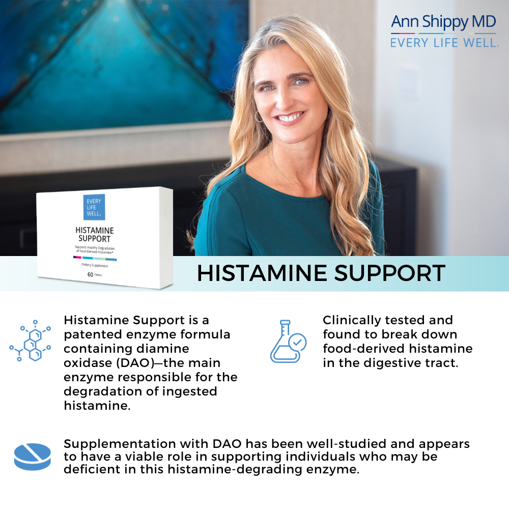 Histamine Support is an enzyme formula containing diamine oxidase (DAO)—the main enzyme responsible for the degradation of ingested histamine. This enzyme has been clinically tested and found to break down food-derived histamine in the digestive tract.