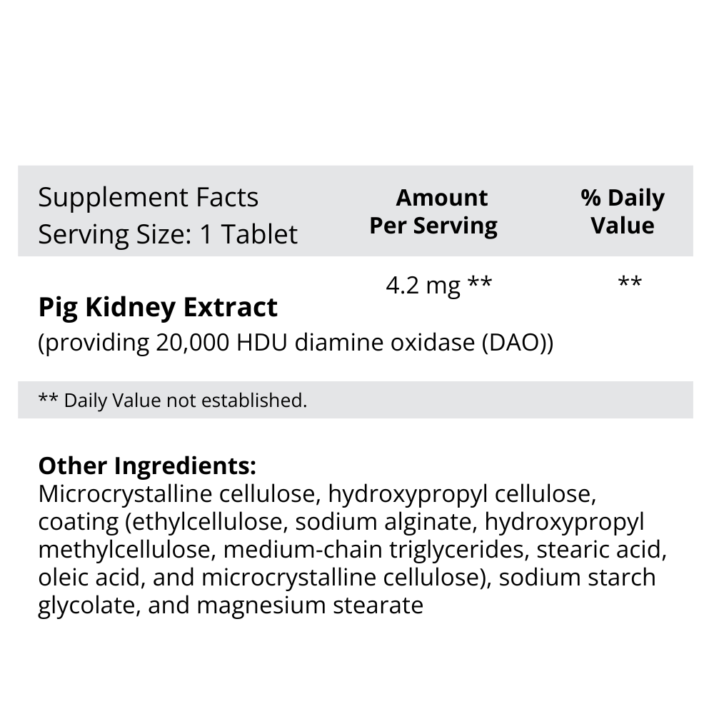 This enzyme has been clinically tested and found to break down food-derived histamine in the digestive tract. DAO is not absorbed and does not have systemic activity.
