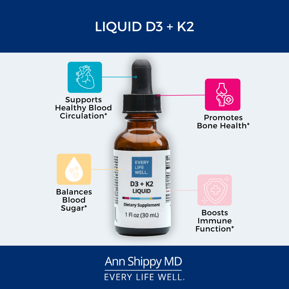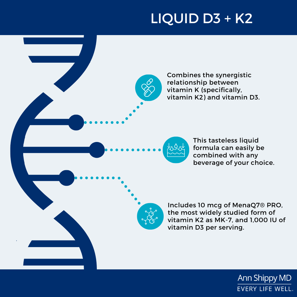 Liquid Vitamin D3 with K2 includes 10 mcg of MenaQ7® PRO, the most widely studied form of vitamin K2 as MK-7, and 1,000 IU of vitamin D3 per serving. The tasteless liquid formula can easily be combined with any beverage.