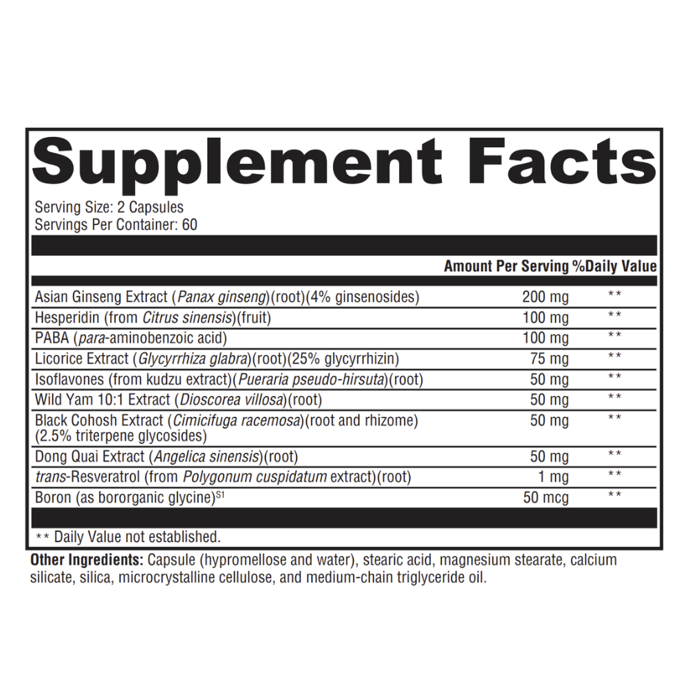 Black Cohosh Extract (Cimicifuga racemosa) (root and rhizome) (2.5% triterpene glycosides) – 50 mg