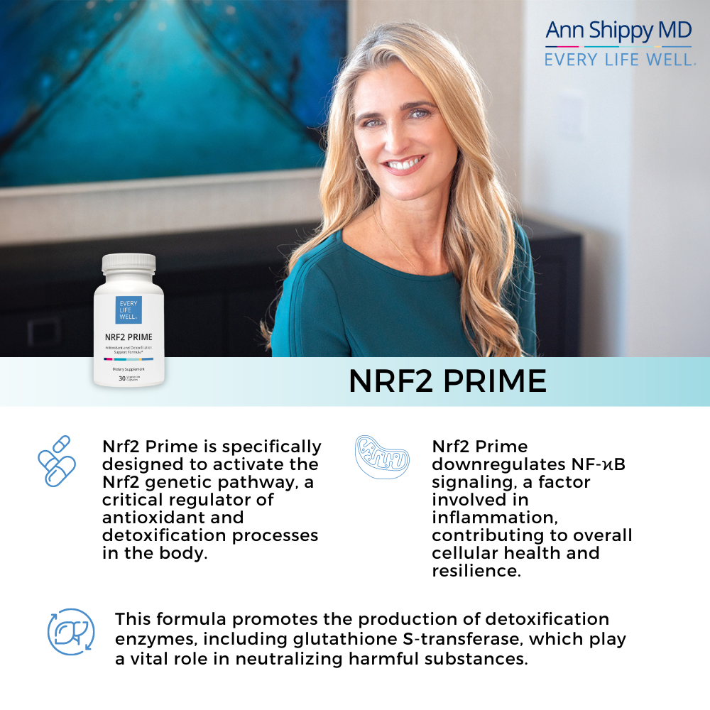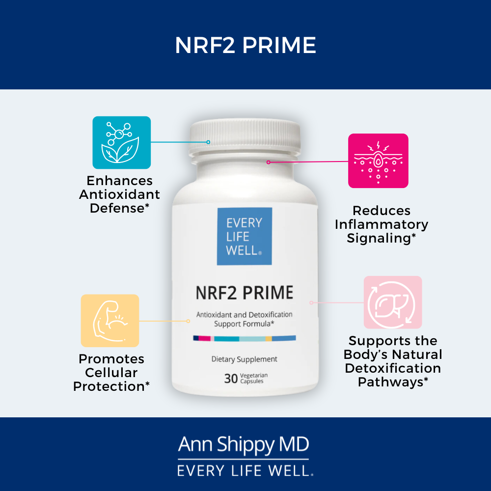 Nrf2 Prime is designed to activate the Nrf2 genetic pathway. This pathway regulates the production of important molecules that impart antioxidant activity, such as glutathione and superoxide dismutase (SOD).