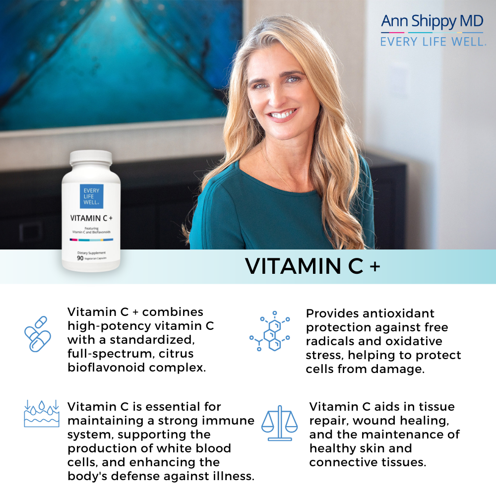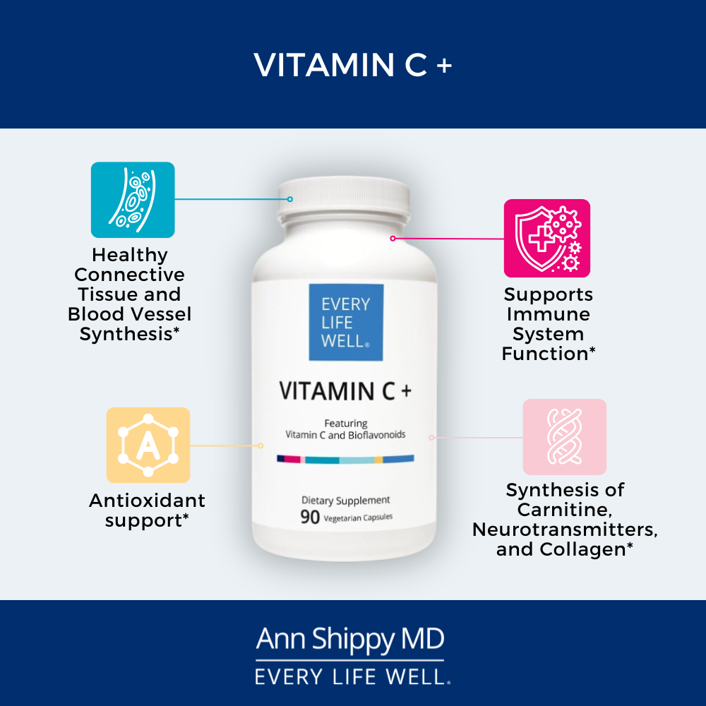 Vitamin C + combines high-potency vitamin C with a standardized, full-spectrum, citrus bioflavonoid complex. Both vitamin C and bioflavonoids have been extensively researched for their roles in supporting antioxidant and immune function.