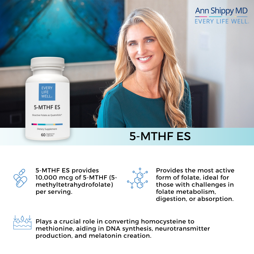 5-MTHF ES provides 10,000 mcg of 5-MTHF (5-methyltetrahydrofolate) per serving.