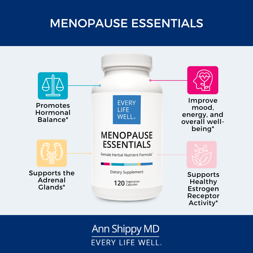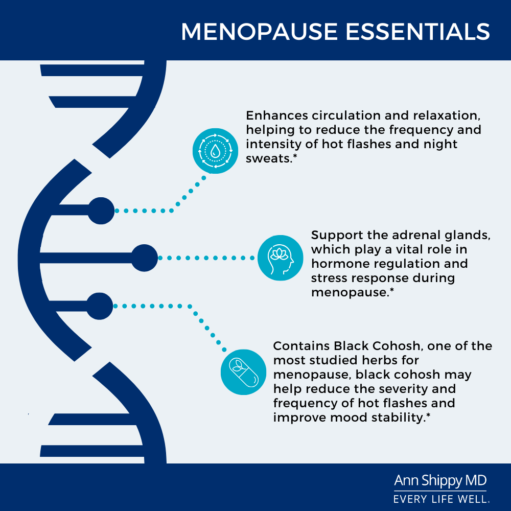 Menopause Essentials is a thoughtfully formulated blend of herbs and nutrients designed to support women through the physical and emotional transitions of menopause. With key ingredients like black cohosh, wild yam, and dong quai to support hormonal balance, licorice and ginseng for adrenal and energy support, and hesperidin and resveratrol for antioxidant and circulatory benefits, this formula offers comprehensive support for hot flashes, mood, sleep, and overall well-being—without relying on soy-based ingredients.*