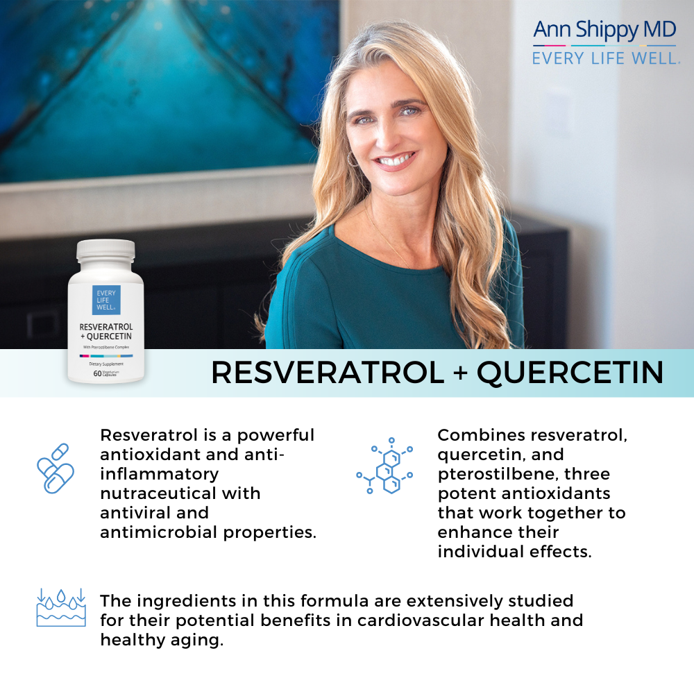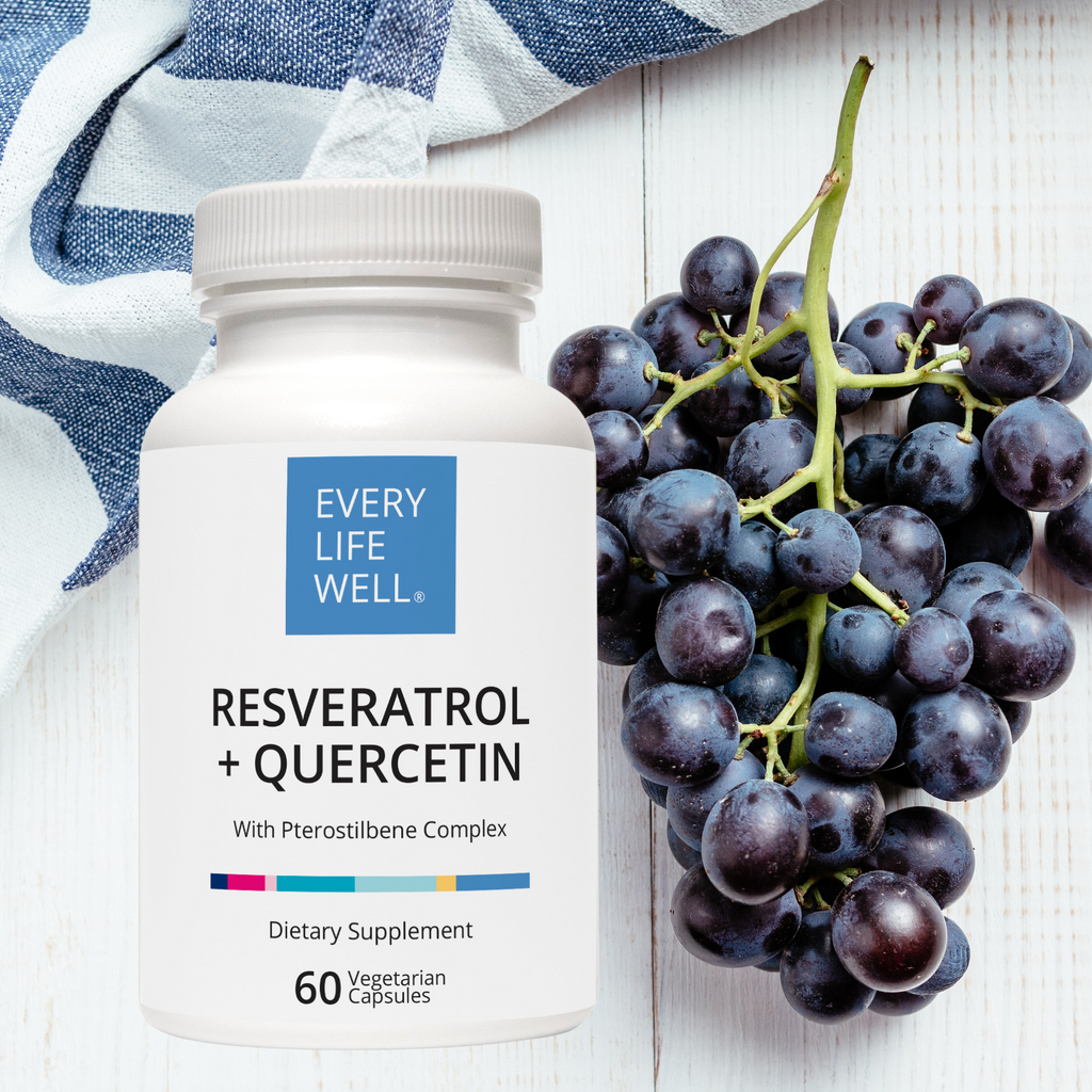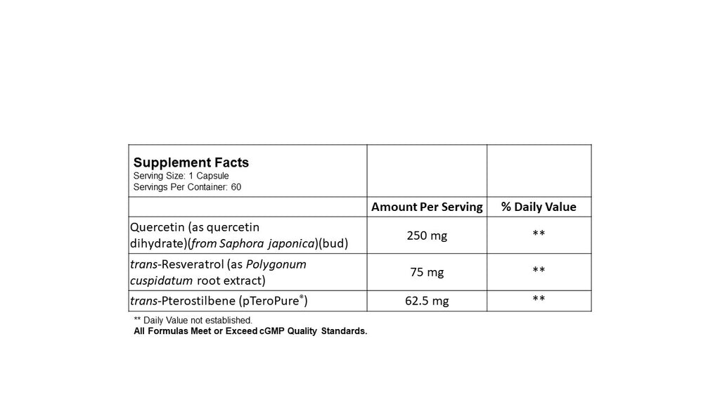 Resveratrol + Quercetin provides a complete bioflavonoid complex with resveratrol, quercetin, and pterostilbene.