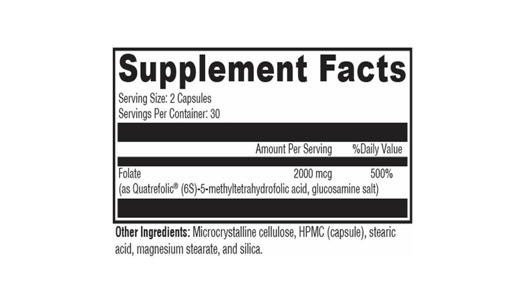- Folate (as Quatrefolic® (6S)-5-methyltetrahydrofolic acid, glucosamine salt) – 2000 mcg (500% Daily Value)