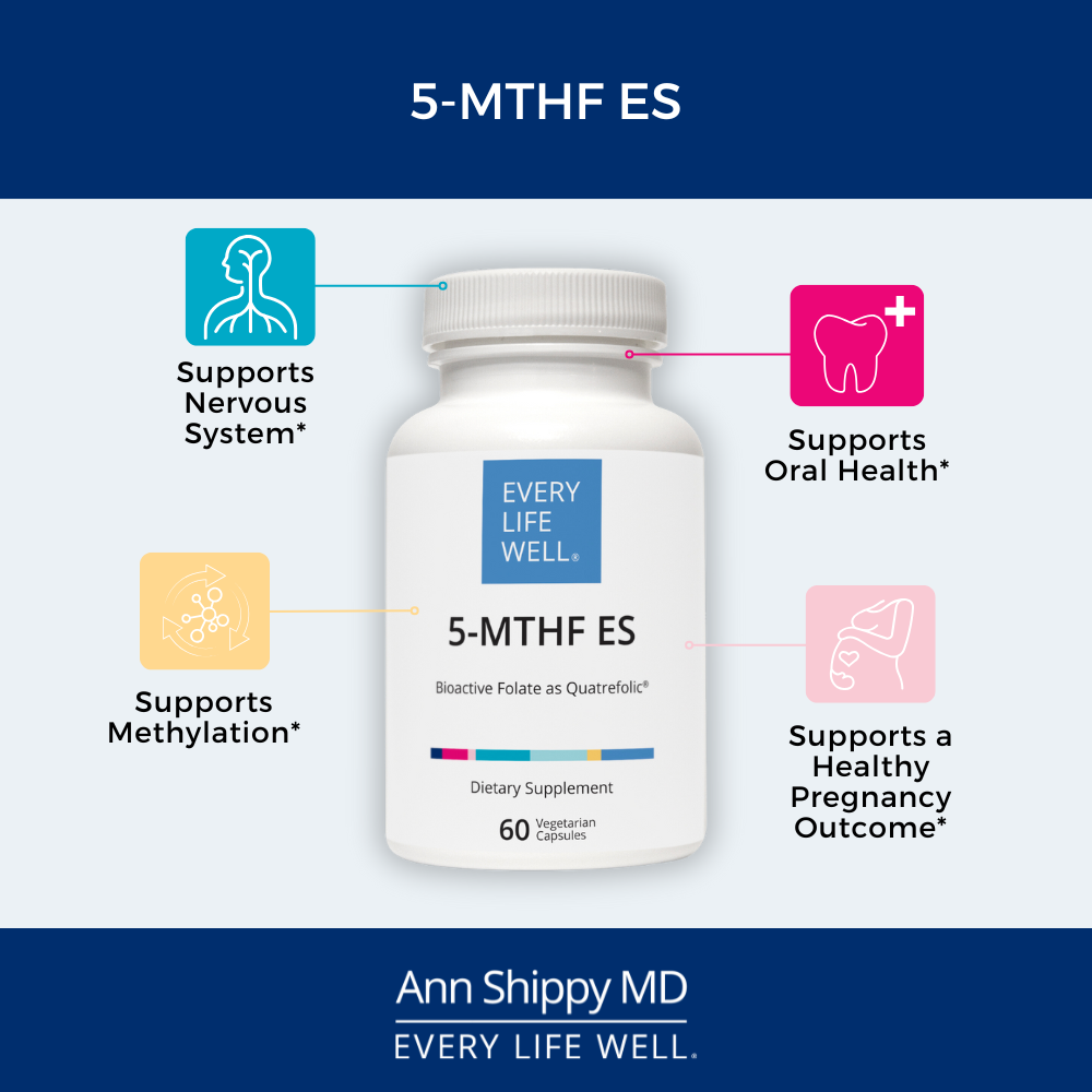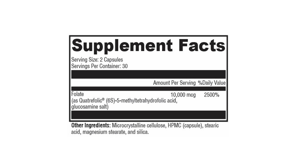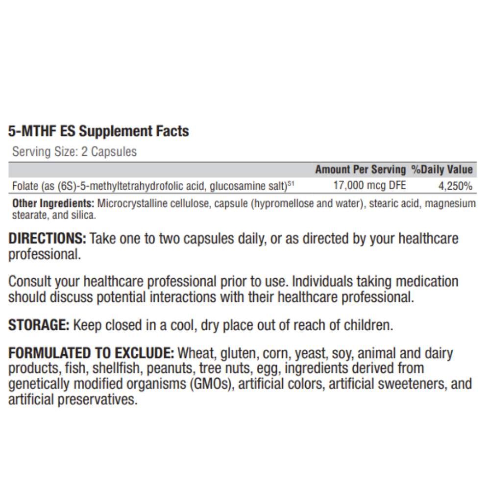 5-MTHF ES provides 10,000 mcg of 5-MTHF (5-methyltetrahydrofolate) per serving.