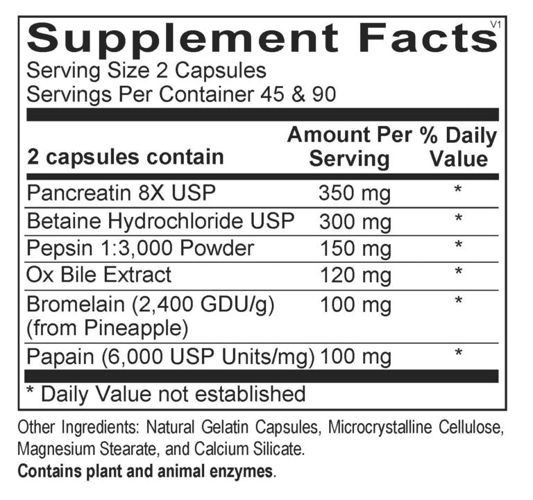 Digestive Enzymes include full-spectrum enzymes strategically designed to support each phase of digestion. In the gastric phase, betaine HCl and pepsin prime the stomach, ensuring proper pH to initiate the first phase of digestion.