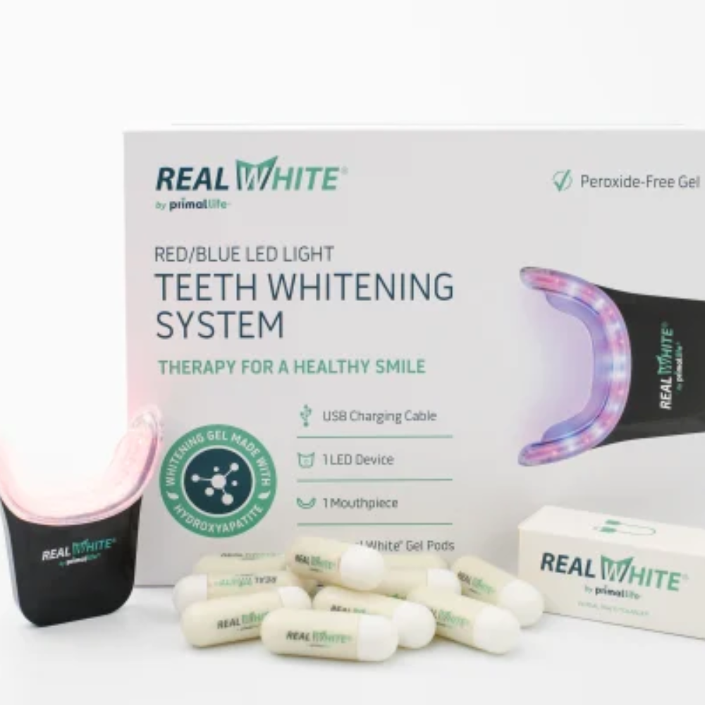 With Primal Life Organics Red/Blue LED Light Teeth Whitening System, your teeth will get stronger as they get whiter. We combined hydroxyapatite (HAp), Phthalimidoperoxycaproic acid (PAP), white activated charcoal, clay, and olive oil with essential oils to eliminate the stains on your smile.